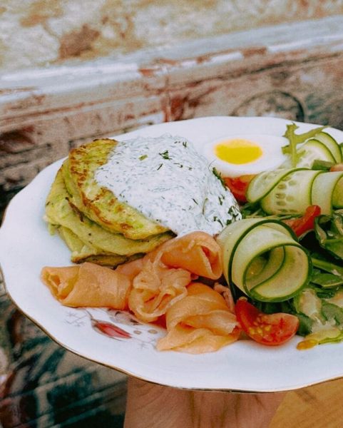 Дещо з меню: кукурудзяний скрембл з фалафелем та печерицями – 175 грн, кабачкові оладки з пряною сметаною – 150 грн, сніданок з мисливськими ковбасками та грибами – 159 грн, вафлі зі скремблом – 190 грн, сицилійська шакшука з базиліком та моцарелою – 175 грн.