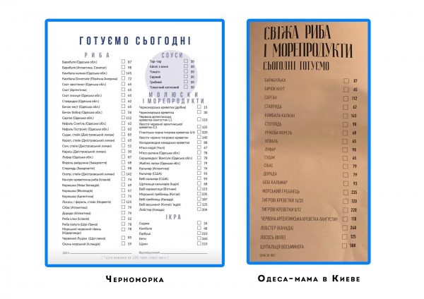 Но при детальном рассмотрении выясняется, что традиция “заимствования” вполне актуальна. Вот, например, дизайн и концепт меню нового ресторана и меню той сети, о которой я говорила ранее. Просто для сравнения.